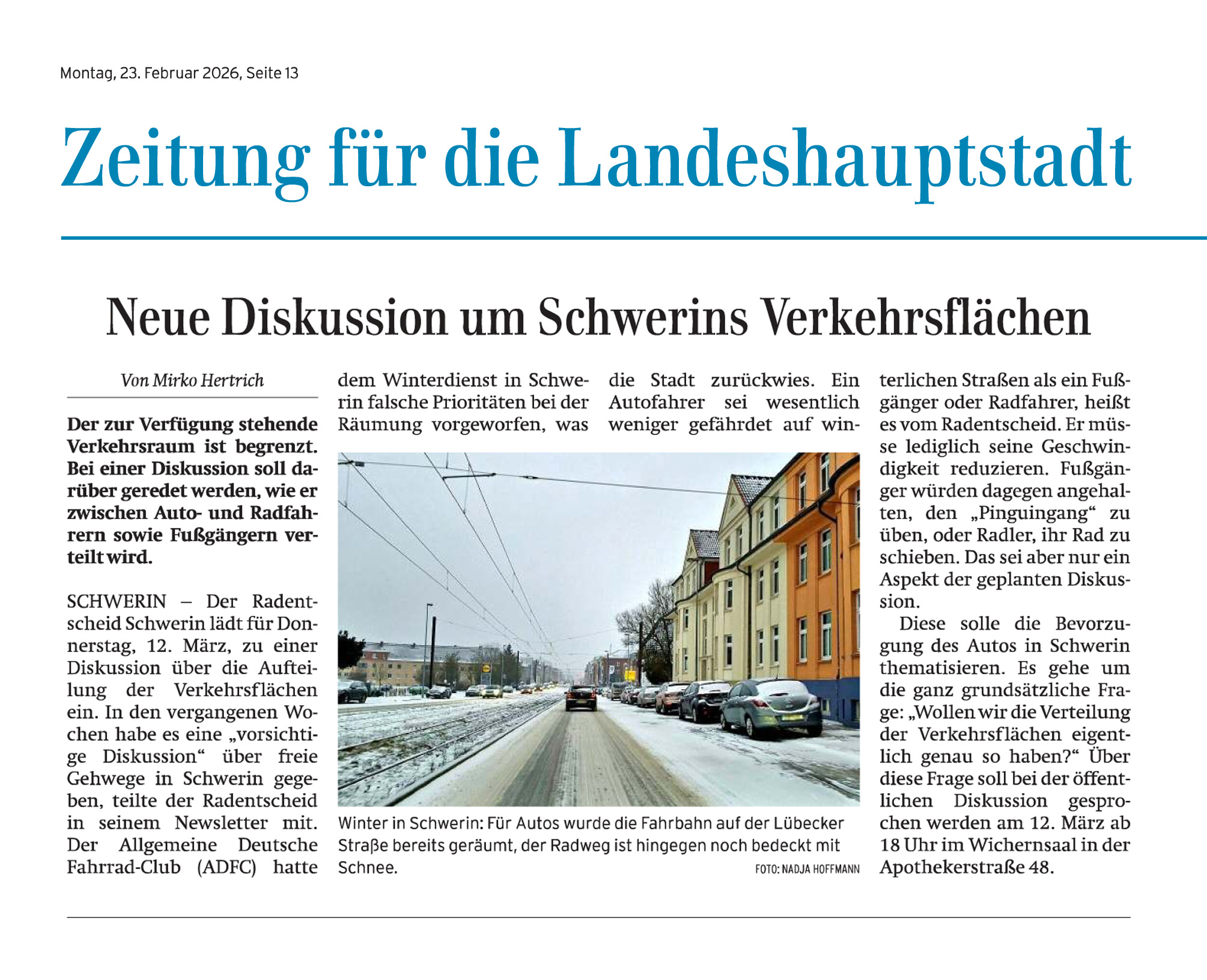 Am letzten Dienstag war der Radentscheid zum ersten Mal in der Beratung im Hauptausschuss. Dort wurde vereinbart, dass das Bürgerbegehren am 26.4. in der Stadtvertretung zur Abstimmung kommt. Grundlage für diesen Termin ist § 20 Absatz 5 der Kommunalverfassung:
