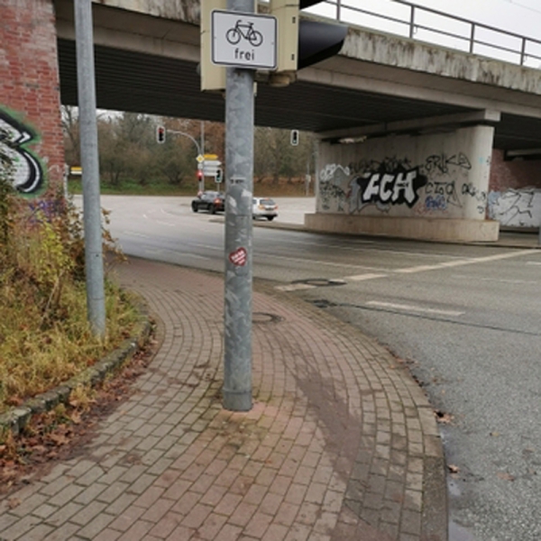 Wie an mehreren Stellen in Schwerin steht die Ampel mitten auf dem Weg. Fußgänger und Radfahrer benutzen diesen Weg in beiden Richtungen, das ist auch durch die Kurve sehr gefährlich.