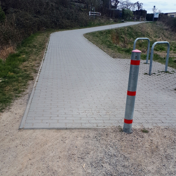 Beim Übergang von Pflaster auf Schotter setzt sich der Schotteruntergrund immer wieder bzw. wird weggespült, weggefahren etc. Es gibt hier eine Stufe im Übergang, die sturzgefährdend ist. Eine Lösung wäre, den Weg um die Kurve zu pflastern.