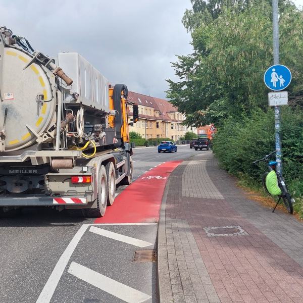 Die Gesamtsituation auf dem Obotritenring ist für Radfahrer unbefriedigend. Hier beim Übergang vom Gehweg auf die Straße wurde eine Rotmarkierung aufgebracht. Das ist zwar eine Verbesserung, durch die zu geringe Breite des Schutzstreifens ist das aber keine abschließende Lösung des Problems.