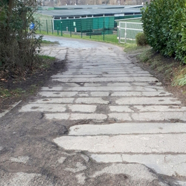 Hier ist der Abzweig von der Bornhövedstraße Richtung Kleingärten auf abschüssiger Strecke mit uraltem Plattenbelag versehen. Weder für Radfahrer noch für Fußgänger ist das komfortabel! Der Belag sollte erneuert werden.
