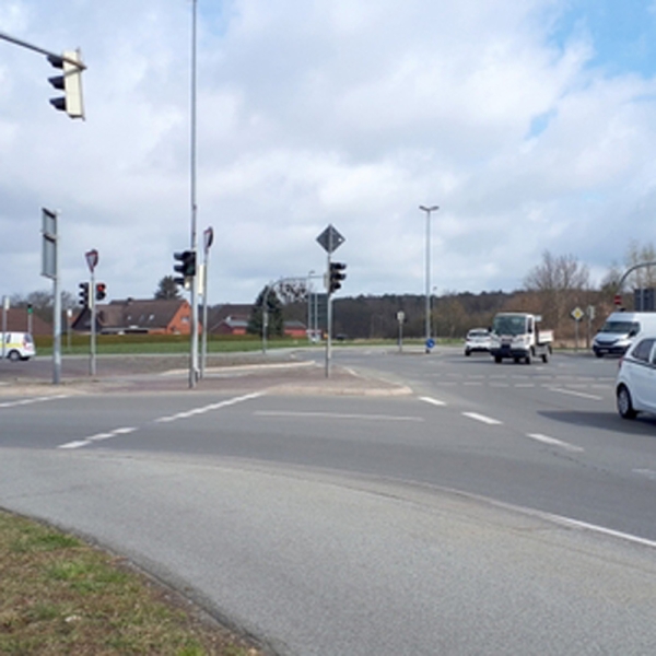 Die Querung der Kreuzung ist für Radfahrer stadtauswärts nur in drei Schritten möglich. Man muss dreimal eine Ampelschaltung anfordern und an jeder dieser Ampeln mehr als eine Minute warten.