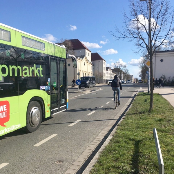 Durch die Verkehrsinsel gibt es immer wieder Überholvorgänge von Kfz und Nahverkehr ohne Beachtung des Mindestabstandes von 1,50 Meter. Der Schutzstreifen ist ohnehin viel zu schmal, hier sollte viel häufiger kontrolliert werden. Eine Rotmarkierung im Querungsbereich wäre hilfreich.