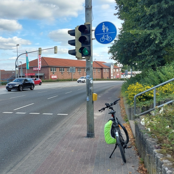 Auch hier steht die Ampel mitten auf einem viel zu zu schmalen gemeinsamen Geh- und Radweg. Sie sollte versetzt werden.