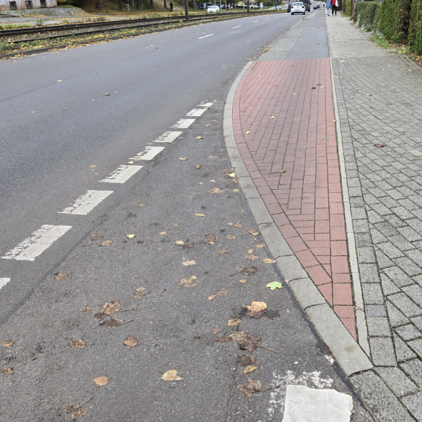 Der Übergang vom Schutzstreifen am Fliederberg in Richtung Lankow ist mit einem abgesenkten Bordstein ausgeführt. Die noch bestehende Kante ist besonders bei Nässe und Glätte gefährlich, weil die Auffahrt in einem sehr spitzen Winkel erfolgt.