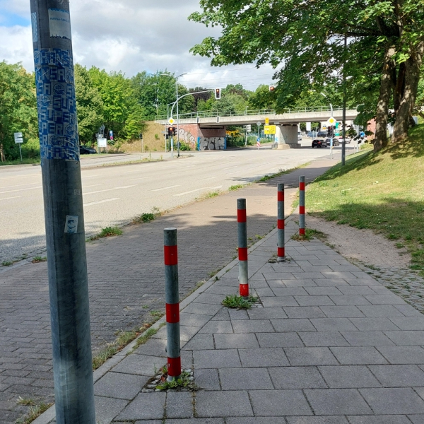 Hier sind einfach zu viele Poller verbaut. Mit Lastenrädern oder Anhängern kann man hier nur durch Rangieren durchfahren.