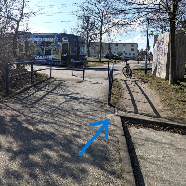 An einigen NVS-Haltestellen gibt es Poller, an anderen diese gefährlichen und hinderlichen Umlaufschranken. Radfahrer zielen hier auf die mit dem Pfeil markierte Stelle, um das Hindernis zu umfahren. So eine Umfahrung sieht man an allen Haltestellen mit Umlaufschranken, die Schranken gehören abgebaut!