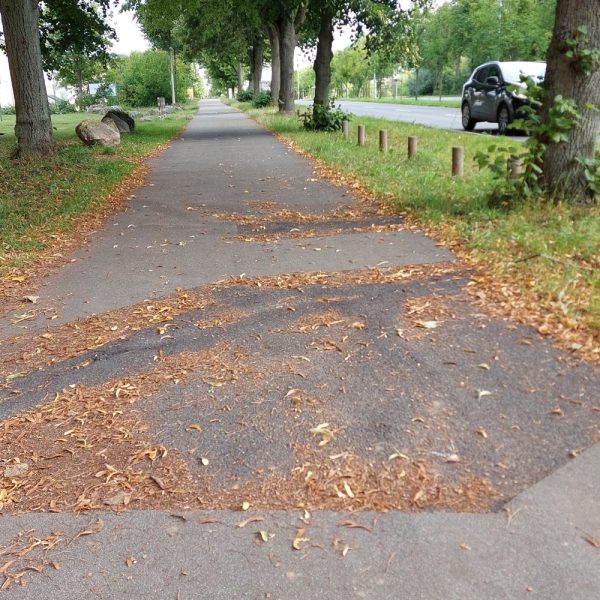 Zwischen Karl-Marx-Allee und Langer Berg ist der Zweirichtungsradweg durch starke Wurzelaufbrüche in einem kaum befahrbaren Zustand. Hier muss dringend saniert werden.
