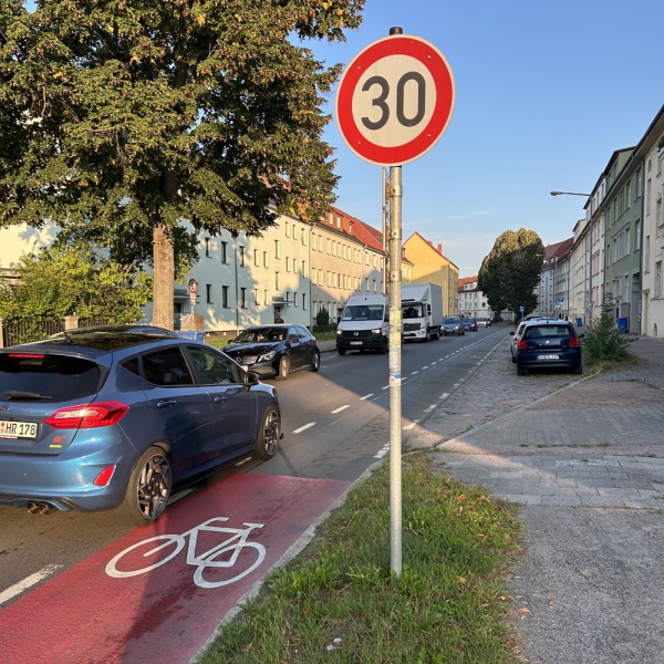 Die Radspur ist viel zu eng. Da hier ausreichend Platz ist, sollte ein baulich getrennter Radweg gebaut werden.