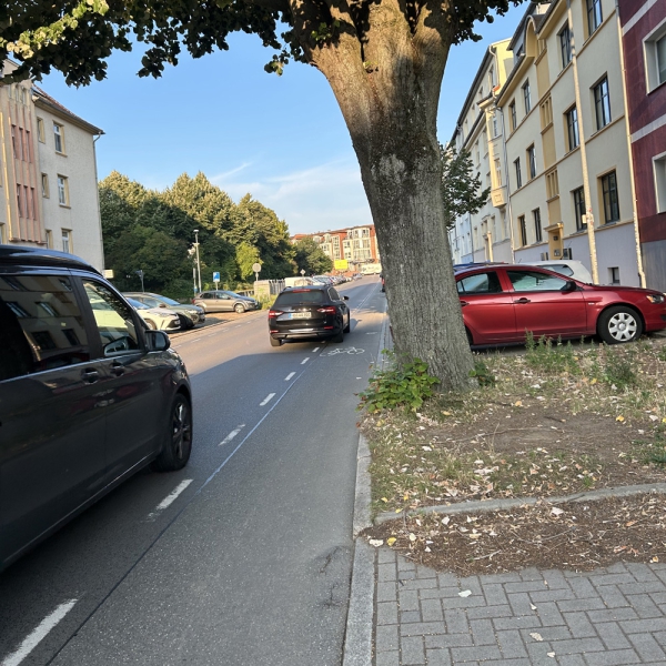 Auf beiden Seiten parken die Autos hier quer. Das ist extrem gefährlich, da ausparkende Fahrzeuge die Radfahrer nicht sehen können. Die Sicht ist durch Bäume und überlange Fahrzeuge zusätzlich eingeschränkt. Die Parkplätze sollten in Längsparkplätze umgewandelt werden, um einen baulich getrennten Radweg zu schaffen. Dieser Weg ist Schulweg für viele Kinder!