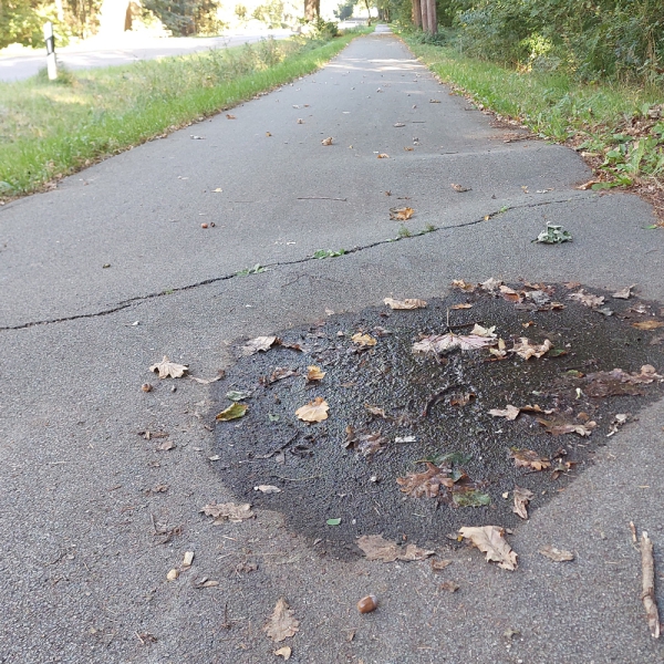Etwa 500 Meter nach der Einmündung zur Kompostieranlage gibt es stadteinwärts Unebenheiten durch Wurzelaufbrüche. Das ist besonders sturzgefährdend bei Begegnungsverkehr, weil ein Ausweichen kaum möglich ist.